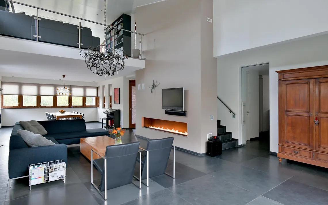 Bij deze villa’s is de basis uitgebreid voor een gezin met drie dochters, om ruimte te bieden aan een veelzijdige werkruimte op de entresol. Hier kan het hele gezin (t)huis-werken met een inspirerend uitzicht op het natuurgebied. Bovendien zorgt de vide ervoor dat er altijd contact is met degene die zich op het benedenverdieping bevindt, in de open leefkeuken of de sfeervolle woonkamer. Dit is echt een biophilisch droomhuis waar natuur, comfort en functionaliteit naadloos samenkomen.
