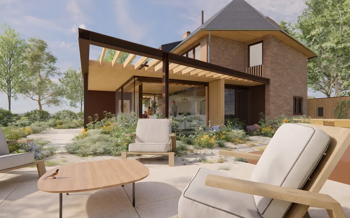Door een paviljoenachtige toevoeging met grote glasvlakken en een doorlopende vloer ontstaat een geleidelijke overgang. De leefruimte kan volledig openen, waardoor de tuin onderdeel wordt van het dagelijks gebruik.